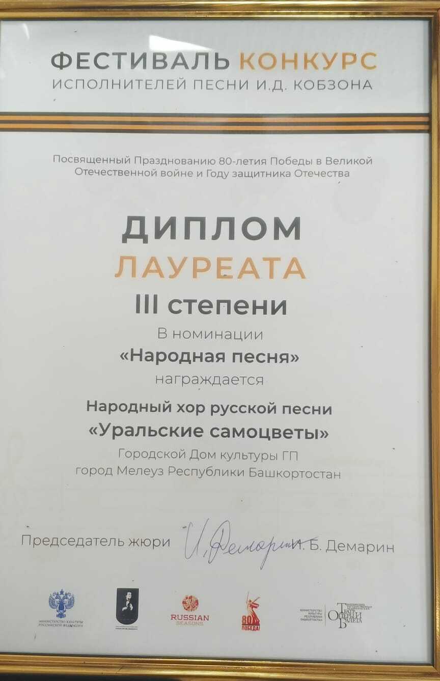 17-18 мая в Уфе прошел Фестиваль-конкурс исполнителей песен Иосифа Кобзона. Мероприятие включало концертную программу, посвященную 80-летию Победы в Великой Отечественной войне и Году защитника Отечества. Фестиваль был организован Академией культуры и творчества имени Иосифа Кобзона и АНО "Русские сезоны" при поддержке Министерства культуры Российской Федерации и Министерства культуры Республики Башкортостан. 17 мая состоялся отборочный тур, в котором приняли участие более 120 конкурсантов в четырех номинациях: академическое пение, эстрадный вокал, народная песня и авторская песня. В Большом зале Башкирского театра оперы и балета прошел Гала-концерт, в программу которого вошли лучшие выступления, отобранные по итогам очных прослушиваний. На гала-концерте выступили не только конкурсанты, но и известные артисты, такие как заслуженный артист России и народный артист Башкортостана Аскар Абдразаков, заслуженная артистка России Ольга Кормухина, заслуженная артистка России Марина Девятова, Игорь Демарин, Мариам Мерабова и другие исполнители. В рамках фестиваля в номинации "Народный вокал" были объявлены победители. Лауреатом I степени стала Фолк-группа "Древо" под руководством Виталия Усова, продемонстрировавшая высокий уровень исполнения и глубокое понимание народной музыки. Лауреатом III степени стал народный русский хор "Уральские самоцветы" под руководством Евгении Усовой, который восхитил зрителей своим гармоничным звучанием и яркими выступлениями. Фестиваль собрал множество талантливых исполнителей и любителей народной музыки, создавая атмосферу единства и культурного обмена. Участники продемонстрировали не только мастерство исполнения, но и богатство русской музыкальной традиции, что сделало это событие незабываемым для всех присутствующих. Поздравляем победителей с заслуженными наградами! Ваш труд, талант и преданность народной музыке вдохновляют и радуют зрителей. Желаем вам дальнейших творческих успехов, новых ярких выступлений и множества поклонников! Пусть каждый ваш шаг на музыкальном пути будет успешным, а каждый новый проект приносит радость и удовлетворение. Всего самого наилучшего!