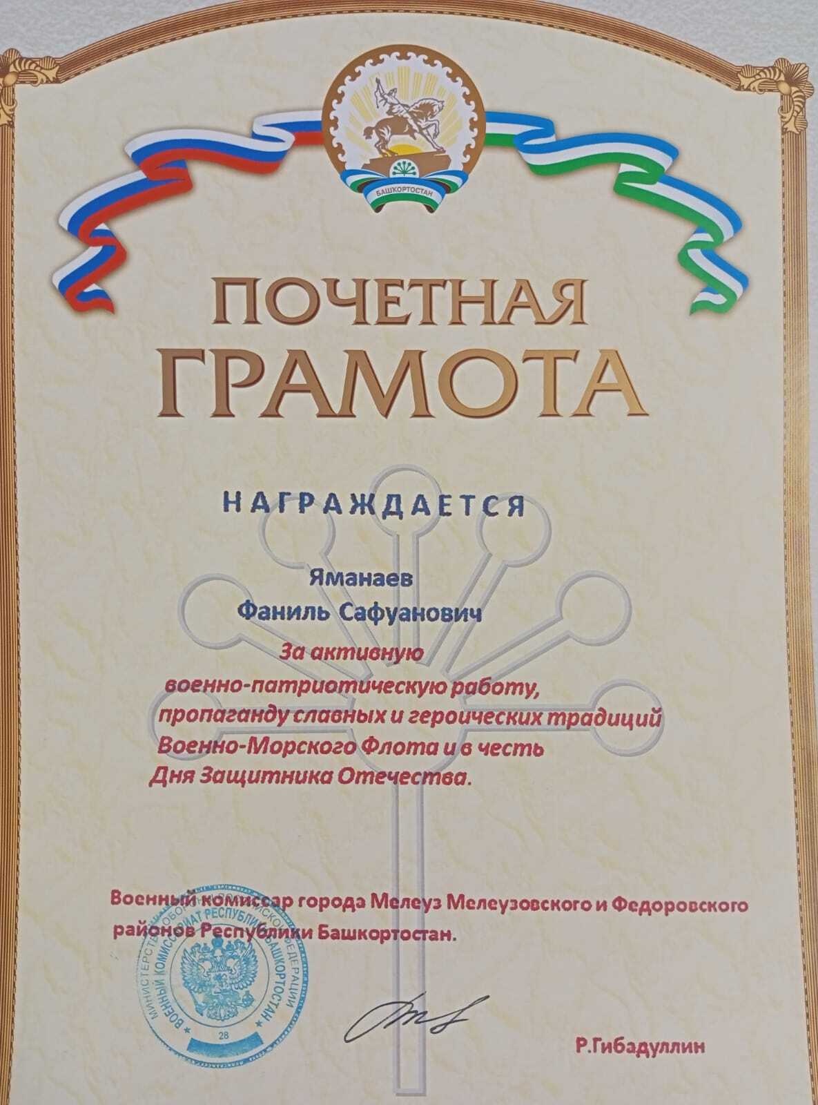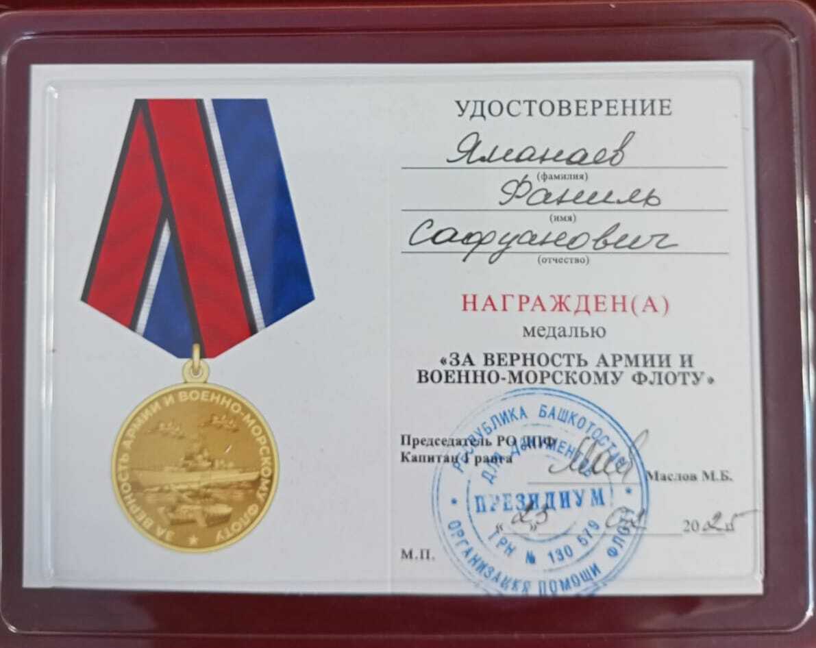 В торжественной обстановке Яманаеву Ф.С. была вручена Почетная грамота "За активную военно - патриотическую работу, пропаганду славных и героических традиций Военно - Морского Флота и в честь Дня Защитника Отчества" и медаль "За верность Армии и Военно-Морскому флоту".