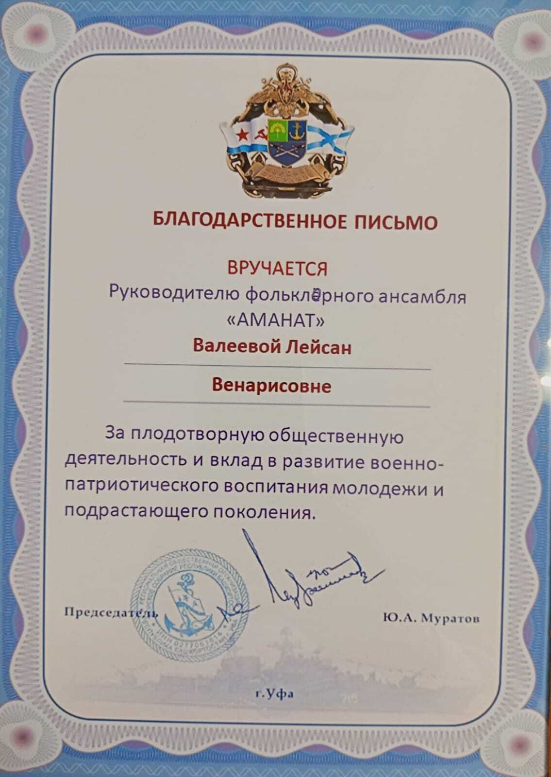 Руководителю вокально - инструментального ансамбля "Аманат" Валеевой Л.В. было вручено Благодарственное письмо "За плодотворную общественную деятельность и вклад в развитие военно - патриотического воспитания молодежи и подрастающего поколения" .