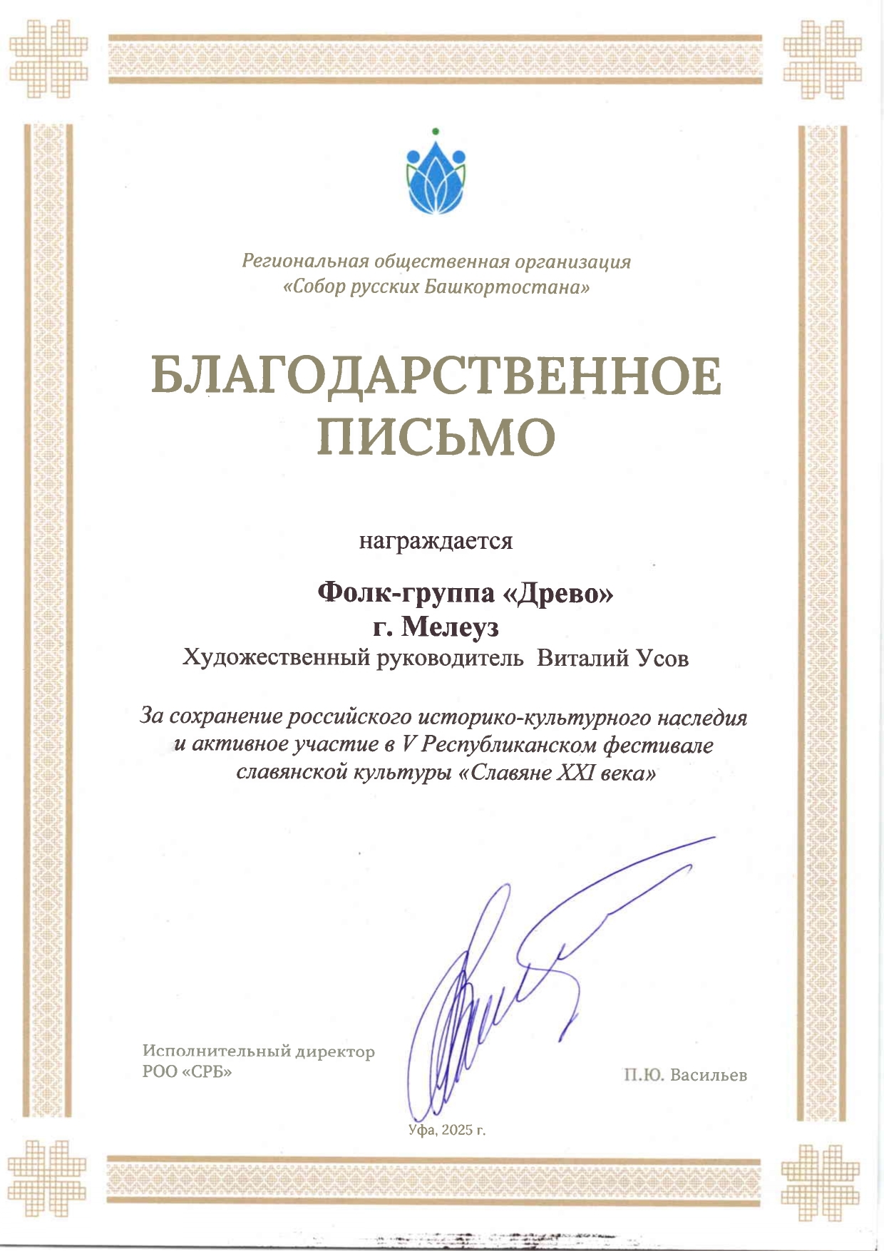 Фолк-группа "Древо" под руководством Виталия Усова приняла участие на V Республиканском фестивале славянской культуры «Славяне XXI века», который прошел на площадке перед Государственным концертным залом «Башкортостан» 30 мая. Фестиваль проходил в рамках мероприятий, посвященных Дням славянской письменности и культуры, а также международной книжной ярмарке «Китап-Байрама».