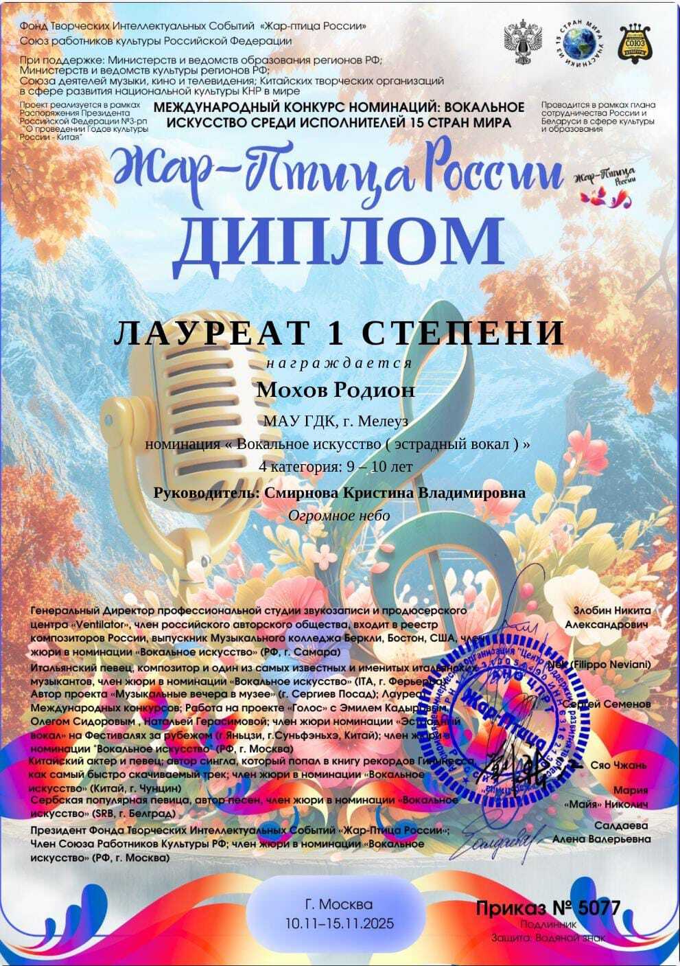 Родион Мохов стал Лауреатом 1 степени, продемонстрировав свой талант и мастерство в конкурсе, собравшем участников из 15 стран мира.