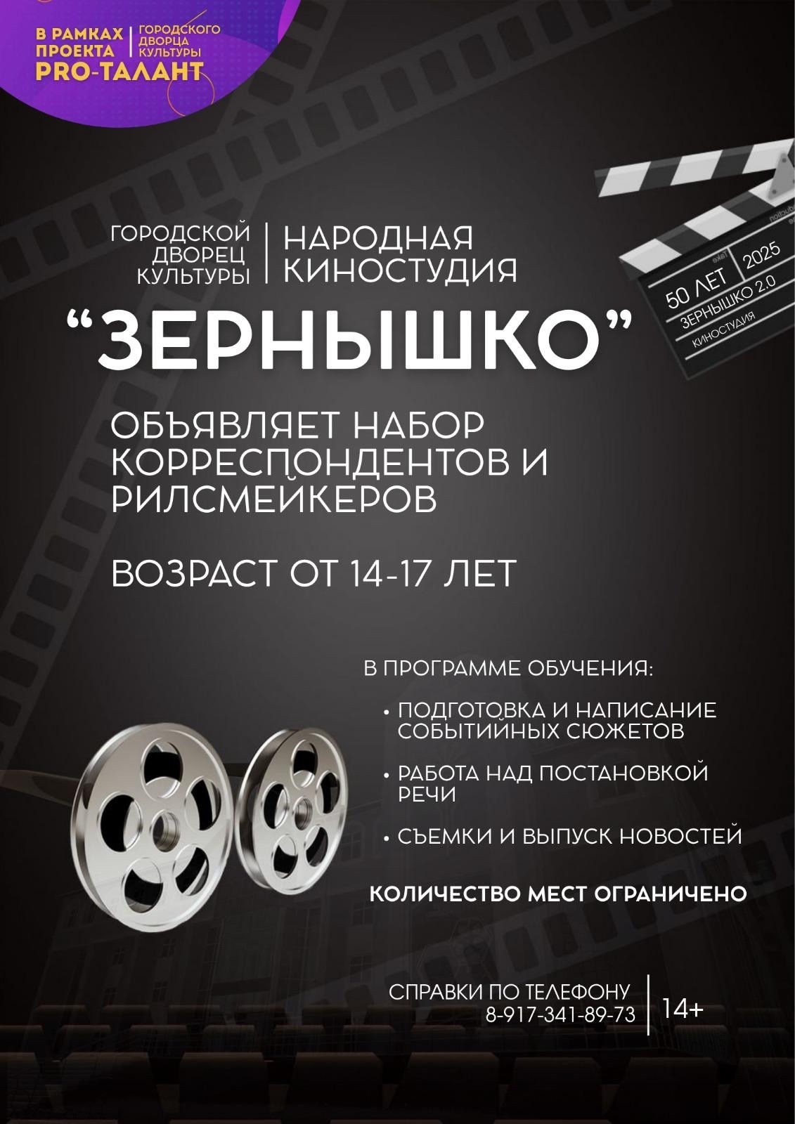 Легендарная киностудия «Зернышко», основанная в 1975 году, отмечает свой 50-летний юбилей! В честь этой знаменательной даты мы с радостью сообщаем о перезапуске творческого направления и объявляем набор талантливых и увлечённых подростков в возрасте от 14 до 17 лет.