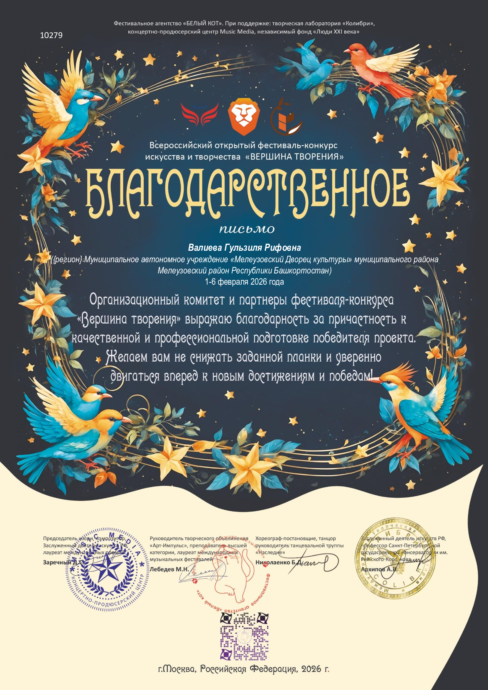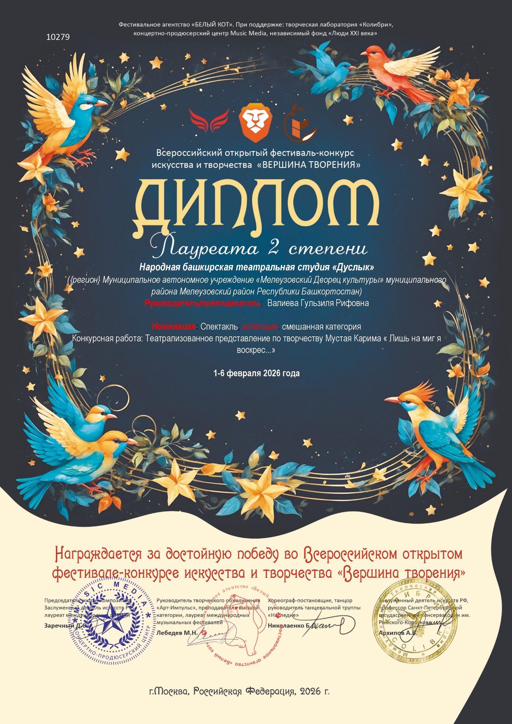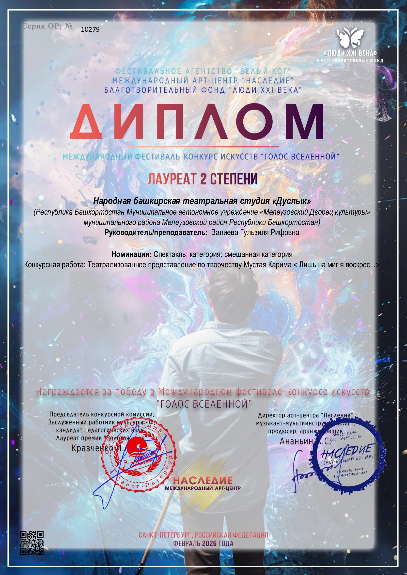 С огромной гордостью сообщаем о блистательном успехе народной башкирской театральной студии "Дуслык" на фестивале "Арт Глобал Фест"! Наши талантливые артисты покорили сердца жюри, завоевав почетное звание Лауреатов II Степени! Театрализованное представление по произведениям великого Мустая Карима, под названием "Лишь на миг я воскрес...", стало настоящим шедевром! Эта победа - заслуга невероятного и преданного своему делу руководителя Валиевой Гульзили Рифовны! Гульзиля Рифовна, Вы - вдохновитель и наставник, раскрывающий таланты и ведущий своих подопечных к вершинам успеха! Ваша любовь к искусству и умение создавать волшебство - бесценны!
