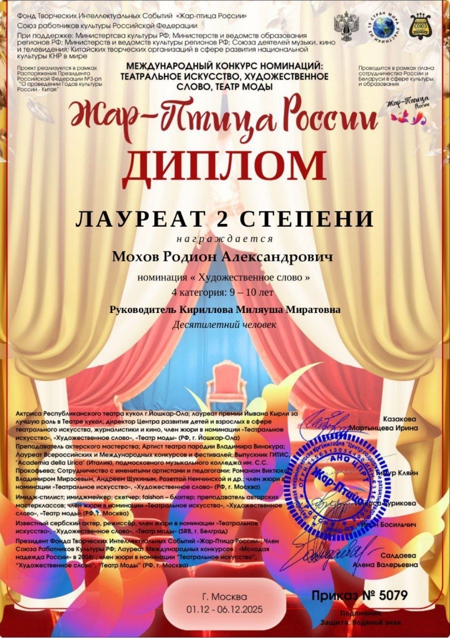В мире искусства, где талант соревнуется с талантом, а вдохновение рождает шедевры, каждая победа – это маленькое чудо. Родион Мохов, талантливый и целеустремленный участник ОТМ "Экспромт", завоевал Диплом Лауреата II степени на престижном Международном конкурсе "Жар-птица России".
